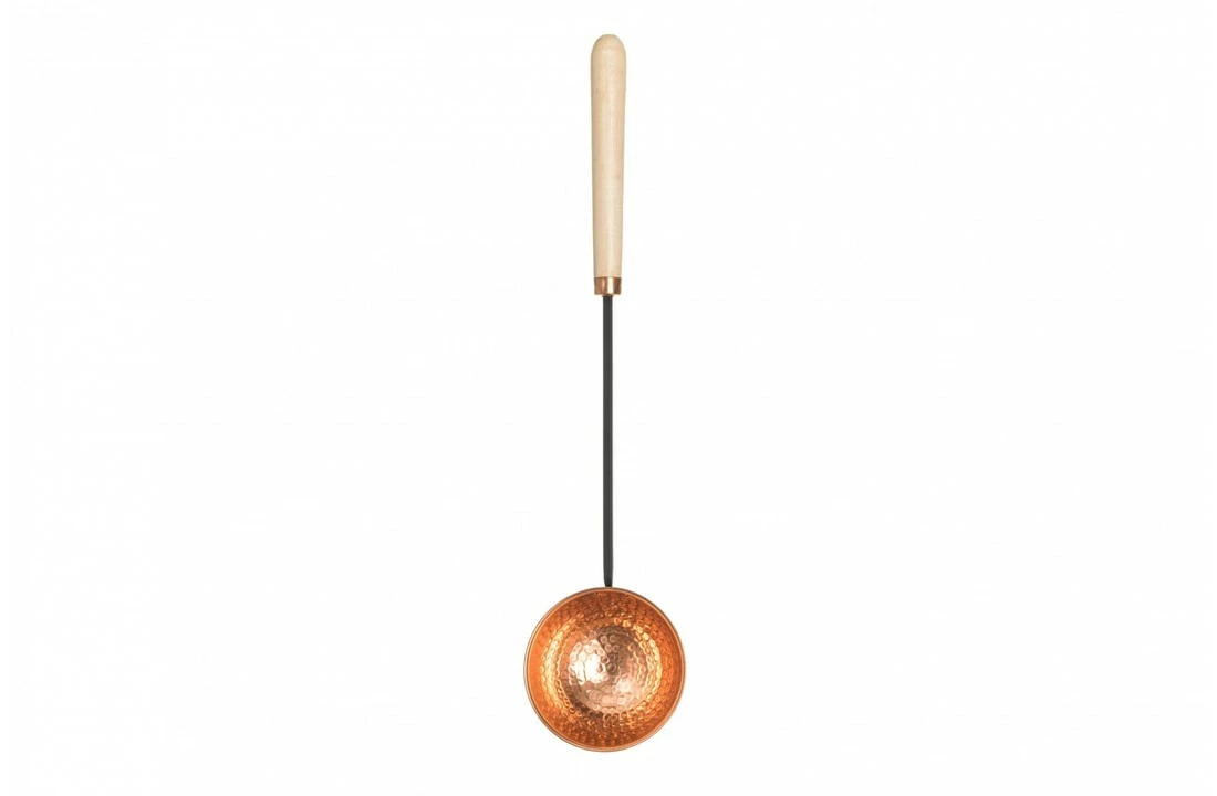 Ideaal accessoire voor de sauna – Zuiver koper materiaal – Massief materiaal – Heeft een licht houten handvat – Houten handvat heeft een gatÂ