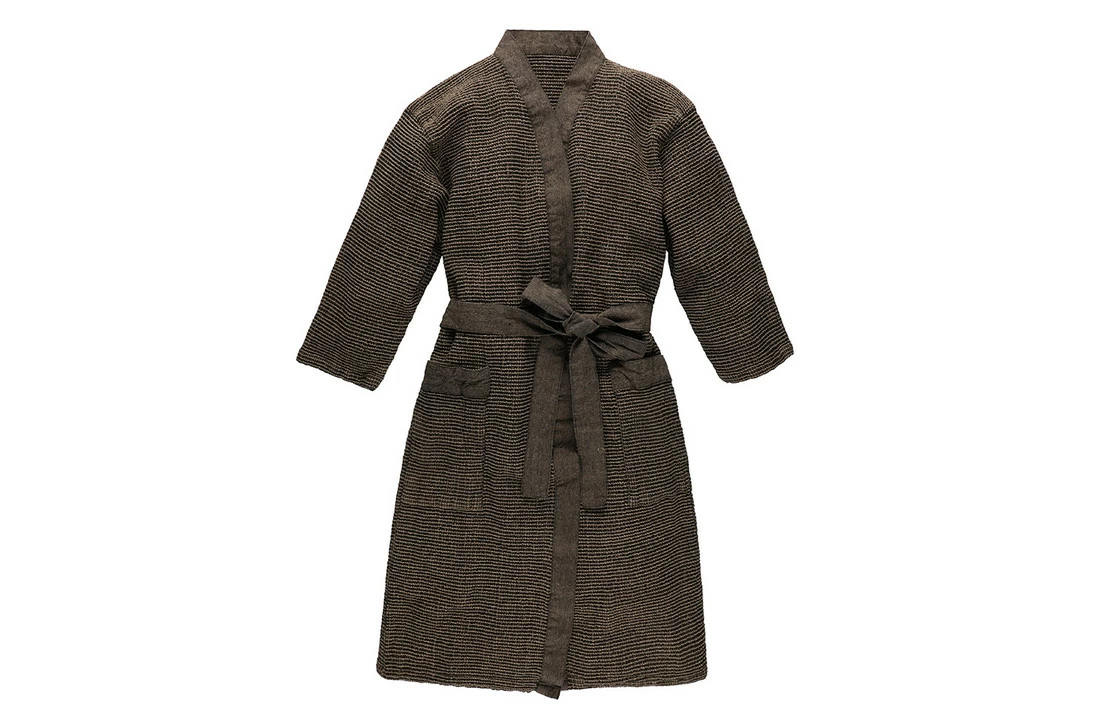 Comfortabele badjas met Chambray boorden en riem. Kenno saunatextiel is gemaakt van gerecycled katoen, waardoor de stof een natuurlijke zachtheid en levendige textuur krijgt.