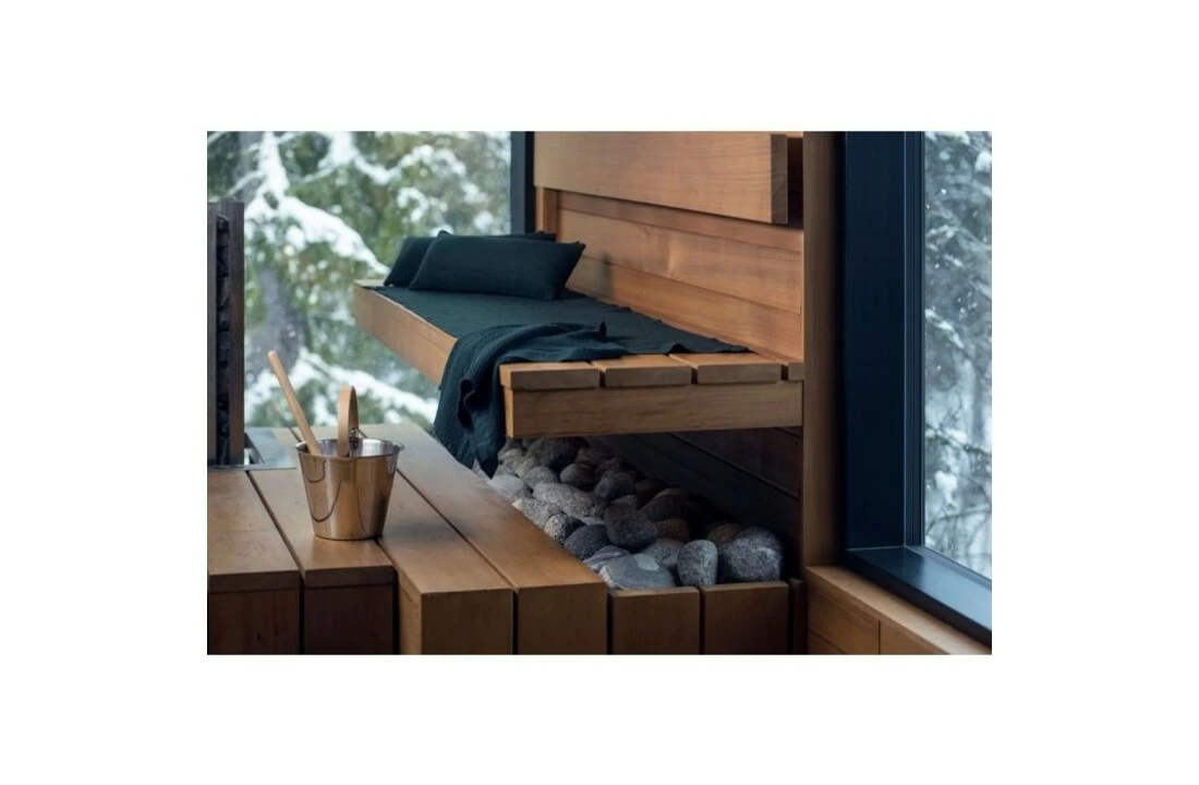 Comfortabel saunakussen met eenzijdige chambray-rand. Voor hoofd- en neksteun op de saunabanken. Kenno saunatextiel is gemaakt van gerecycled katoen, waardoor de stof een natuurlijke zachtheid en levendige textuur krijgt.