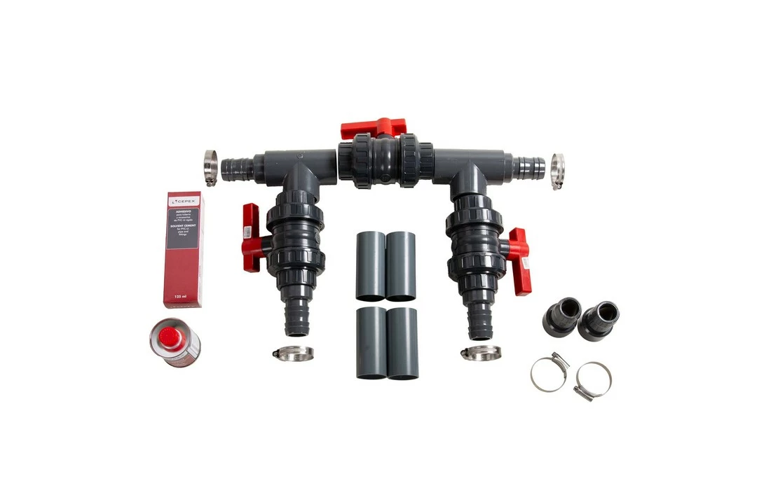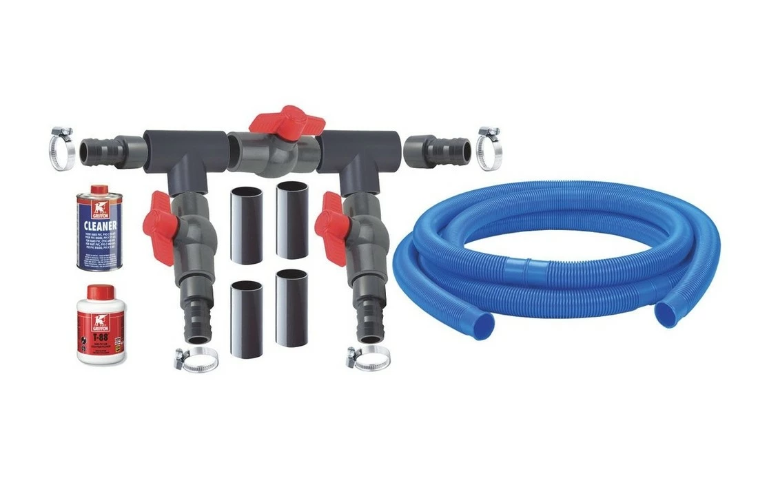 Complete set voor het aansluiten van de zwembadverwarming op het filtersysteem. Speciaal voor ecologische zwembad verwarming systemen en geschikt voor opzet zwembaden.