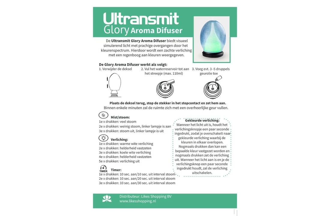 De Ultransmit Aroma Diffuser is zeer geschikt voor het verdampen van essentiële oliën. Het water in de Aroma Diffuser wordt door middel van trillingen met een hoge frequentie omgezet in stoom, waardoor een koude verneveling ontstaat. De Aroma Diffuser is hierdoor uitstekend geschikt om in huis, kantoor-, salon- en praktijkruimte te gebruiken. De Aroma Diffuser Glory is voorzien van een mooi glazen kap met verschillende soorten blauwe tinten in verwerkt zijn. De Aroma Diffuser heeft een fraaie verlichting. De kleuren van de verlichting lopen op een rustgevende manier in elkaar over, maar kan ook op één kleur vastgezet of helemaal uitgezet worden. Â